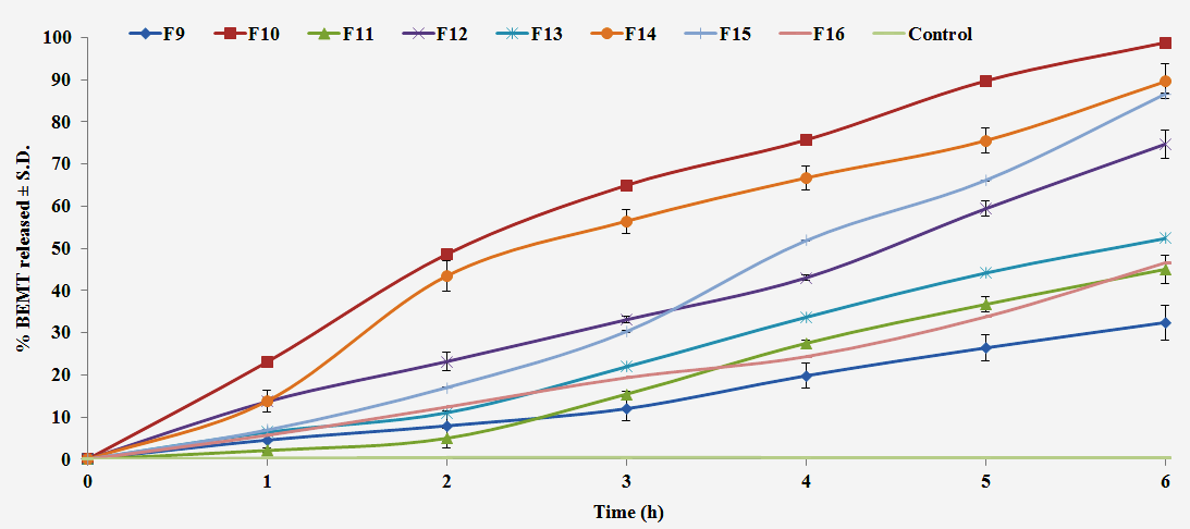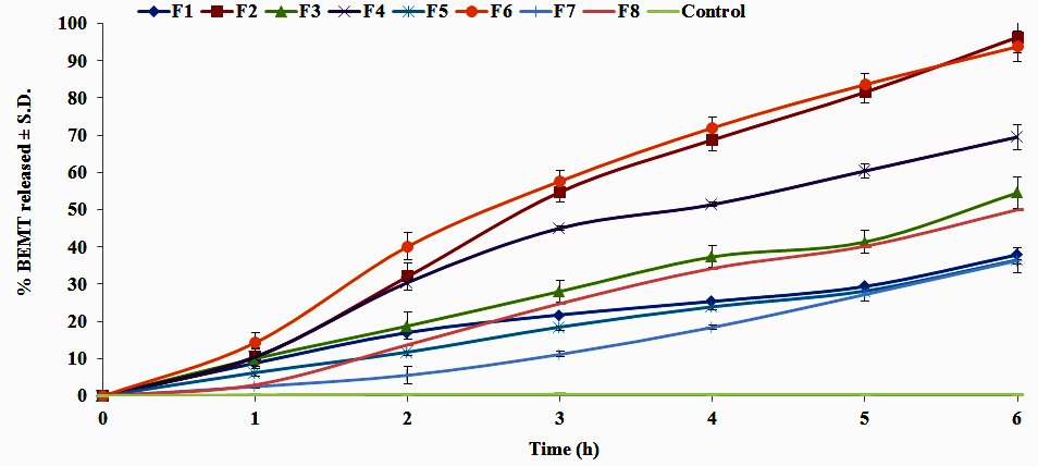 Fig. 3: Release pattern of BEMT from different prepared nanoemulsion formulae using Labrafac PG