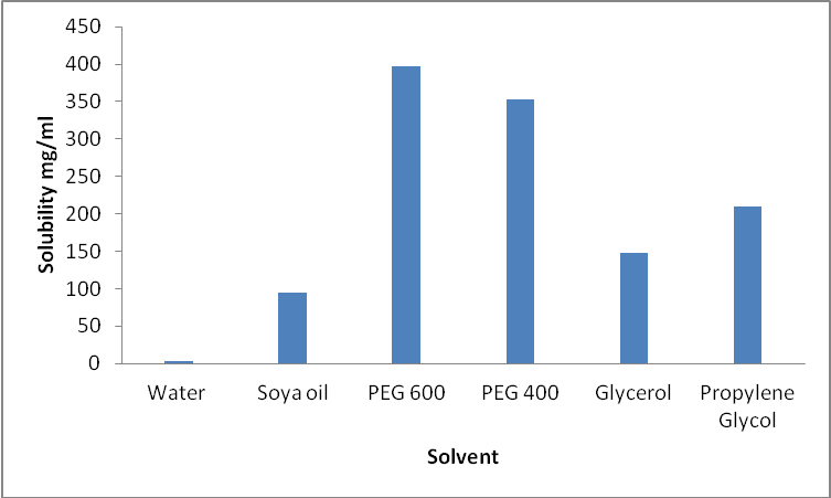 The solubility was found maximum in PEG 600. Compatibility results indicated that 100 % hydrophilic solvents cannot be used. Capsules being a unit dosage form entire dose should be incorporated in one capsule whose size is acceptable for human consumption. This led to trials of different methods for solubility enhancement.