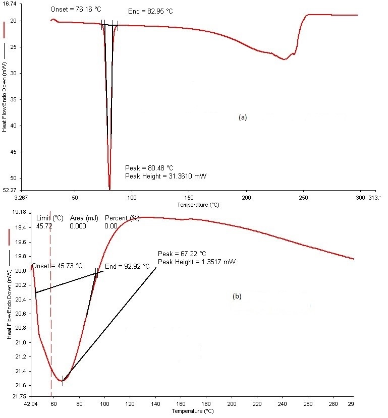 Fig. 3: DSC thermogram of (a) ibuprofen and (b) formulation of ibuprofen