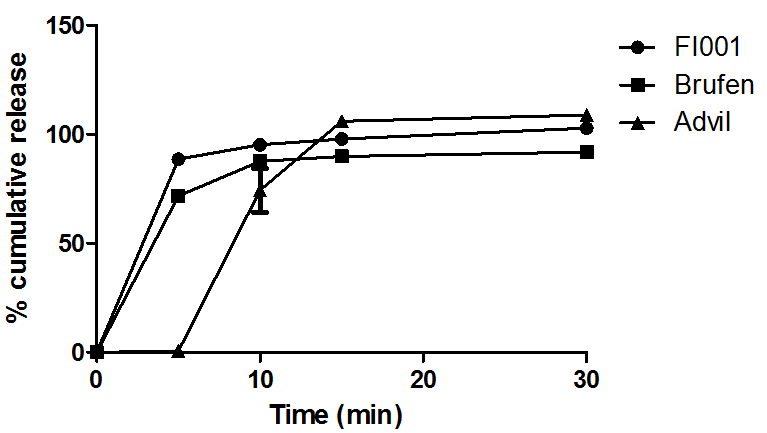 The dissolution studies were performed on the formulated capsule (batch 0007 labeled as FI001), Advil®, a marketed softgel formulation and Brufen®, a marketed compressed tablet. The dissolution profiles of three different solid oral dosage forms were statistically compared.
