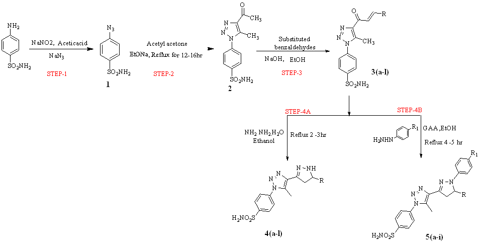 The synthesis of compounds 4(a-l) and 5(a-i) is given under fig 1. In this scheme, the intermediate 4-(4-acetyl-5-methyl-1H-1,2,3-triazol-1-yl)benzenesulfonamide (2) was synthesized by diazotization of 4-amino benzene sulphonamide and followed by condensation of 4-azidobenzene sulphonamide with acetylacetone in presence of sodium ethoxide under reflux for 12-15 h. Claisen Schmidt condensation reaction of intermediate (2) with various substituted aromatic aldehydes under basic conditions gave chalcones 3(a-l). In the final step, reaction of chalcones 3(a-l) with hydrazine hydrate in ethanol under reflux for 3-4 h gave 4-(5-methyl-4-(5-phenyl-4,5-dihydro-1H-pyrazol-3-yl)-1H-1,2,3-triazol-1-yl) benzene sulfonamides 4(a-l) (Step 4A) in good yields. Simultaneously, intermediate (3) condensed with different substituted phenylhydrazines in ethanol under reflux for 4-5 h to obtain 4-(5-methyl-4-(5-phenyl-4,5-dihydro-1H-pyrazol-3-yl)-1H-1,2,3-triazol-1-yl)benzenesulfonamides of series-2 [5(a-i)] (Step 4B) in good yields. All the derivatives were characterized by 1H NMR, IR and ESI-MASS spectral data.