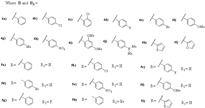 All the chemicals and solvents used were of synthetic grade from SD fine chemicals Ltd., (Mumbai, India), and avra chemicals pvt ltd Hyderabad. Completion of the reaction was monitored by analytical thin layer chromatography (TLC) using E-Merck 0.25 mm silica gel plates. Visualization was accomplished with ultraviolet (UV) light (256 nm) and iodine chamber. Synthesized compounds were purified by the re-crystallization process. The purity of the compounds was checked by a single spot in TLC and solvent system for TLC was determined on trial and error basis. Melting points were determined in open capillary tubes using ANALAB melting point apparatus and were uncorrected. All the 1H NMR spectra were recorded on varian 400 MHz spectrometer using DMSO-d6 as solvent and tetramethylsilane (TMS) as an internal standard. Chemical shift values are listed in δ scale. The FT-IR spectra were recorded on schimadzu FT-IR spectrophotometer by using 1% potassium bromide discs. Mass spectra of the compounds were recorded on electronic spin ionization mass spectra (ESI-MS) on aglient 1100 series.