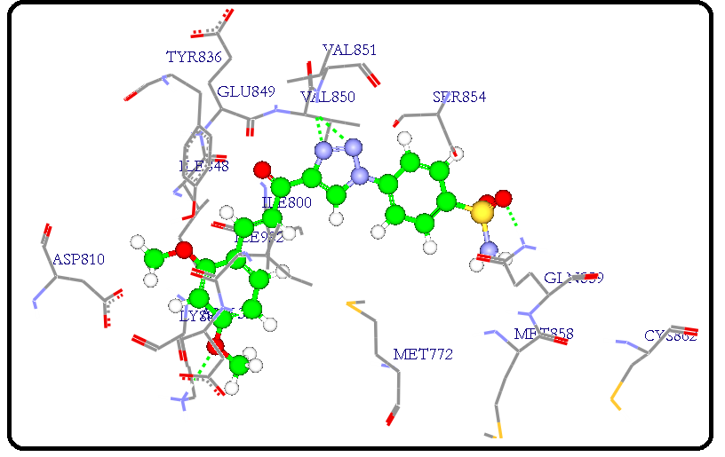 Table 1 depicts the Libdock scores of top-ranked complex pose per compound along with their binding energies and number of hydrogen bonds. The molecular docking results of synthesized compounds revealed that among all the docked compounds, compound 3i possessed the high Libdock score of 145.031 compared with the reference ligand KKR exhibiting a Libdock score of 88.35. Docking confirmation of reference ligand KKR with the active site of protein was shown in fig 2. From the table 1, it is revealed that all the compounds displayed convincing dock scores ranging from 145.031 to 122.165, which implies that the designed molecules possess a related mode of binding and valid binding affinity against the protein just as the reference ligand. The compound 3i is well fitted into the binding site of PI3Kα by hydrogen bonds and other close interactions. The interaction of the protein PI3Kα and compound 3i is shown in fig 3. From results it was observed that four hydrogen bond interactions were presented in the docked pose with compound 3i, two bonds with VAL851 and a single bond with each of the residues GLN859, LYS802. N10 and N11 of the compound 3i interact with H-atom of the amine group of VAL851 forming two hydrogen bonds (A: VAL851: HN-3i: N10 and A: VAL851: HN-3i: N11) with a hydrogen bond distance of 1.941 Å and 2.359 Å respectively. Third hydrogen bond was formed when the hydrogen atom of GLN859 interacted with the oxygen atom of the compound 3i (A: GLN859:HE22-3i: O23) with a hydrogen bond distance of 1.882 Å. Another hydrogen bond was formed between the hydrogen atom of LYS802 and the oxygen atom of the compound 3i (A: LYS802:HZ3-3i: O) with a hydrogen bond distance of 2.449 Å. A few non-bonded interactions were found between the compound 3i and the residues TYR836, SER854, GLU849, VAL850, ILE932, ILE848, ASP810, ILE800, MET772, ASP933, MET858, and CYS862.