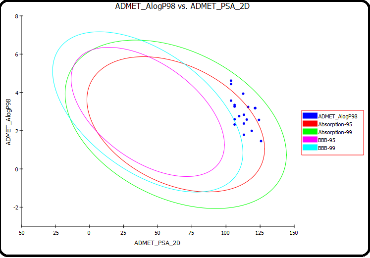 Fig. 4: Plot of PSA versus LogP for candidate compounds showing the 95 and 99% confidence limit ellipses corresponding to the blood–brain barrier and intestinal absorption models