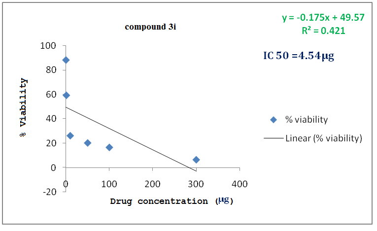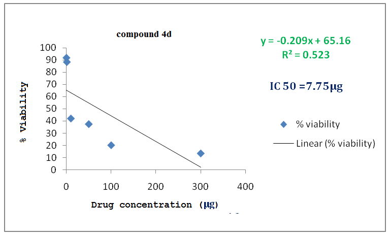 The title compounds were evaluated for In vitro antiproliferative activity via MTT ([3-(4, 5-dimethylthiazol-2-yl)-2,5-diphenyl tetrazolium bromide]) based cytotoxic assay[31] against MCF-7 breast cancer cell line with taxol as standard reference. Cell lines were purchased from the national institute of nutrition (NIN) Hyderabad. Cells were harvested from the logarithmic phase of cultures and re-suspended in Dulbecco’s Modified Eagle’s Medium supplemented with 10% fetal bovine serum (FBS). The cell counts were adjusted and equal number of cells were plated into each well of 96-well culture plates and allowed to grow overnight at 37 °C, in presence of 5% CO2. The cells were treated with test substances at various concentrations as indicated for 72h. In vehicle control culture wells, a maximum of 0.5% DMSO was added. Culture medium was renewed at every 24h with fresh culture medium supplemented with test substances. Thereafter, 0.5 mg/ml of MTT reagent was added to each well and the microplate was incubated further for 4h at 37 °C in presence of 5% CO2. Finally, the cells were solubilized by adding solubilizing solution and allowed to incubate at 37 °C overnight. After complete solubilization of the formazan crystals the absorbance was read at 540 nm in a microplate reader (Bio-Rad, USA). The results (mean OD±SD) obtained from quadruplicate wells were used in the calculation to determine the cytotoxicity (50% of inhibitory concentration, IC50) of the test compounds.