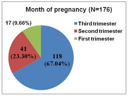 Highest number of population 118 (67.04%) of the study population were in the third trimester during the study period, 41 (23.30%) of the population were in the second trimester and the least of the population, 17 (9.66%) were in the first trimester.