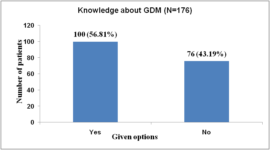 Monitoring awareness of GDM among pregnant women was one of the objectives of the study. A questionnaire containing nine questions was used to monitor the awareness of pregnant women with GDM. Patient’s responses to each question were as follows.
