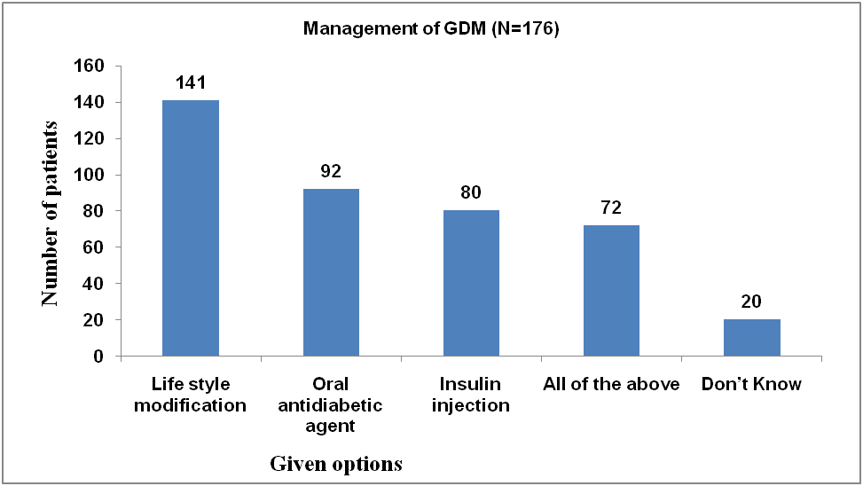 The question was ‘What are the treatment options for GDM?’ Three options along with all of the above and don’t know were given and the patient responses were noted. For this question, the patient selected more than one option. 141 patients thought lifestyle modification was the management option for GDM, 92 patients thought oral hypoglycemic agents, 80 patients thought insulin injection, 72 patients selected all of the above and 20 patients selected they don’t know the answer.