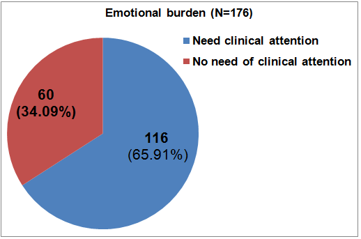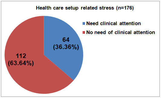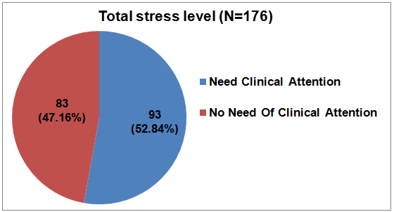 Total GDSS score gives an overall stress level in patients. Whether the patient needed clinical attention or not could be detected using total GDSS score. Among the study population, 52.84% of the study population needed clinical attention and 47.16% of the population did not need clinical attention.