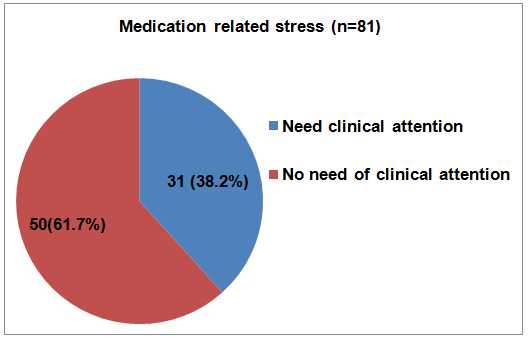 This is the second subscale in GDSS, which include 3 items. Patients only on lifestyle modification were not monitored for medication-related stress. The 3 items included in this subscale are related to medication. Which are like ‘Taking insulin for GDM is painful’, ‘Every time when I take insulin or oral anti-diabetic agents I feel bad’ and ‘I feel that I am taking too much of medications’. Among the 81 patients who were on medication for GDM, 38.2% of the study populations needed clinical attention and 61.7% of the study populations did not need clinical attention.