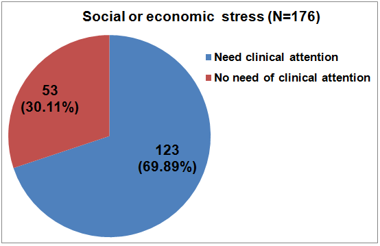 This is the third subscale of the GDSS which include 3 items. The three items included in this subscale are ‘I spend more money than what I estimated because of GDM’, ‘I don’t get enough support from my family and friends’ and ‘I am not able to be normal because of various restrictions due to GDM.’. 69.89% of the populations needed clinical attention for social or economical stress and 30.11% of the populations did not need clinical attention for the same.