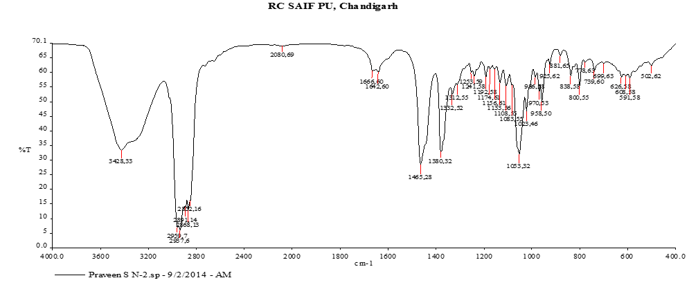 The isolated phytochemical was found as a white amorphous solid compound with melting point of 169-170 °C. The UV λmax value was 257 nm. In IR spectrum of AM, a very intensely broad peak at 3428 cm-1 and moderately intense peak at 1192 and 699 cm-1were observed for the O-H bond vibrations of hydroxyl group. The out of plane C-H vibrations of the unsaturated part was observed at 881 cm-1. The corresponding C=C vibrations was shown around 1642 cm-1 as weakly intense peak. The stretching and bending vibrations of methyl part were noticed by the intense peak 2937 cm-1and medium intensity peak at 1465 cm-1. The vibration of the methylene part was shown by the peak at 2852 cm-1 and the medium peak at 1460 cm-1. The moderately intense peak at 739 cm-1was attributed to the rocking movement of methylene part. The corresponding C-C vibration was shown as weak intense peak at 1053 cm-1.