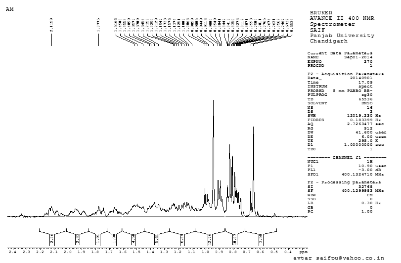 The 13C-NMR has shown recognizable signals at 140.8 and 121. ppm, which corresponds to double bond at C-22 and C-6 double bonds respectively as well as it also represent signals at 130.1 and 129.1 ppm, which shows one more double bond in between C-5 and C-23. The δ value at 71.6 ppm is due to C-2 β-hydroxyl group. The signal at δ 31.7 and δ 12.8 ppm corresponds to angular carbon atom at C-25 and C-27 respectively. Mass spectrum of compound AM showed parent molecular ion [M+] peak at mlz 412 which corresponds to the molecular formula C29H48O. This assignment is overall in good agreement for the structure of Stigmasterol as described by [30-33].