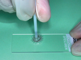 OralCDx (OralScan Laboratories, Inc.) is a computer-assisted oral biopsy system that collects trans-epithelial cellular samples. [fig. 2a]. This system contains a specialized brush for the brush biopsy, a glass slide, a form, a fixative (alcohol/ polyethylene glycol), and a container for sending samples to the CDx laboratory [19]. [fig. 2b]. The procedure involves placement of the brush on the lesion and rotating it for 5-10 times till it produces reddening or haemorrhagic spots [fig. 2c]. The obtained cell material is placed on a dry slide, fixed, and sent for analysis [20-22]. [fig. 2d]. Highly keratinized leukoplakia is a contraindication for the use of this method, as it does not allow enough basal cells to be gathered. Also, inflammatory conditions frequently give atypical results. TB is a fast and relatively simple procedure that does not cause bleeding or require anesthesia. Currently, the technique is combined with molecular analysis. This increases its specificity and permits the identification of genetic anomalies, such as mutations of the tumor suppressing gene p53, epigenetic alterations, and genomic instability. Reported sensitivity values ranged from 71.4% to 100% and specificity from 32% to 100%.