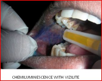 Chemiluminescence by definition is the emission of light from a chemical reaction [23]. Vizilite, a diagnostic tool for the early detection of oral cancer is based on the principle of chemiluminescence [fig. 3]. The kit contains 1% acetic acid solution, a capsule with an outer shell of flexible plastic and an inner vial of fragile glass, and a retractor [22]. Activation requires breakage of the glass vial by bending the capsule. This permits the chemical products to react and produce a bluish-white light with a wave length of 430-580 nm that lasts for around 10 min [24]. The procedure involves a one-minute mouthwash with 1% acetic acid solution. Under diffuse bluish-white chemiluminescent light, normal mucosa absorbs the light and appears blue, whereas the light is reflected by abnormal cells with a higher nucleus: cytoplasm ratio and by epithelium with excessive keratinization, hyperparakeratinization, and / or significant inflammatory infiltrate, which appear acetowhite with brighter, more marked, and more distinguishable borders [25-27]. ViziLite® system enhances the clinician’s ability to detect oral lesions, particularly white lesions and those with white and red areas. The sharp borders between normal and abnormal oral mucosa is easily delineated by ViziLite plus. Also, the borders observed usually extended beyond than those detected in the visual examination [8, 27]. The majority of these lesions can be diagnosed with incandescent light, and that mouthwash with acetic acid allowed the additional detection of some lesions [25]. The reported sensitivity is 100% and the specificity ranges from 0%-14.2%.