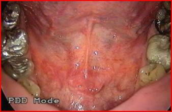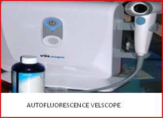 Use of tissue autofluorescence has been used for the screening and diagnosis of pre-cancerous and early cancers of the lung, uterine cervix, and skin. More recently, it has been used in the oral cavity. The changes in the structure and metabolism of the epithelium and sub-epithelial stroma alter their interaction with intense blue light (400 to 600 nm) [10, 28]. Velscope system is a tissue fluorescence imaging system used for inspection of the oral mucosa [10, 12, 29]. [fig. 4]. Under the intense blue light (400 to 600 nm), normal oral mucosa emits a green auto-fluorescence, whereas abnormal areas absorb the fluorescent light and appear dark. Hence, early detection of pathological lesions is possible by detecting the early biochemical changes even before their evident appearance. Velscope system seems to be very promising due to its ability and effectiveness in identifying the visually occult lesions and lesion margins that are occult to visual examination under white light [29]. The sensitivity values range from 97% to 98% and specificity from 94% to 100%.