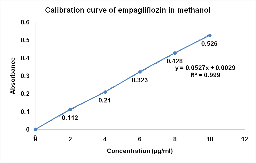 Fig. 1: Calibration graph of Empagliflozin in methanol at 221.3 nm, empagliflozin in methanol follows the Beer–Lambert’s law in the concentration range of 2-10 µg/ml