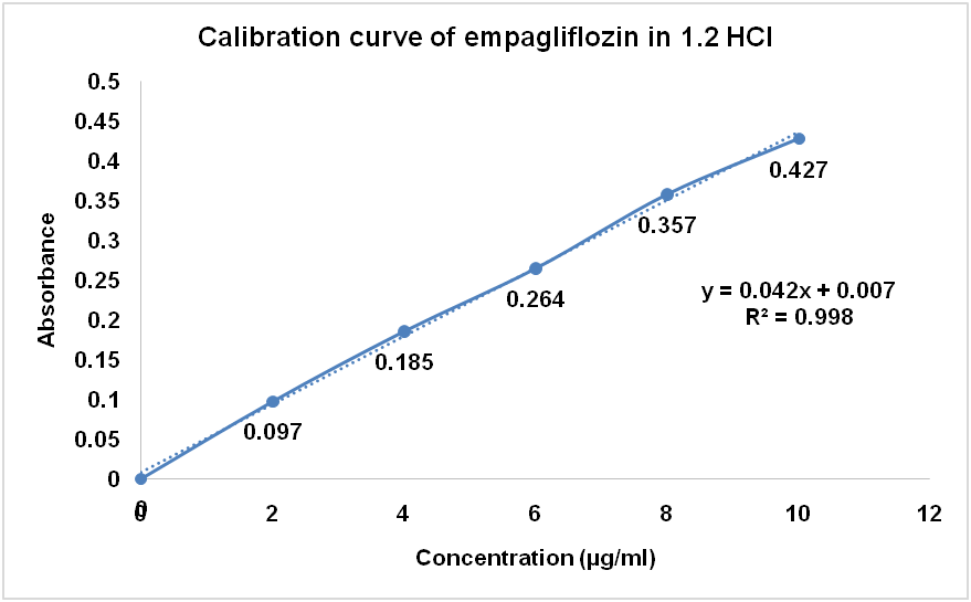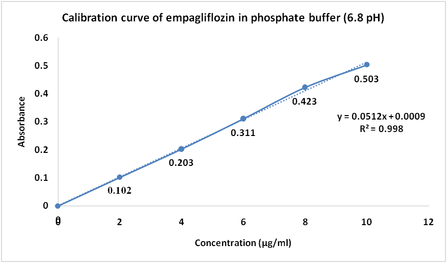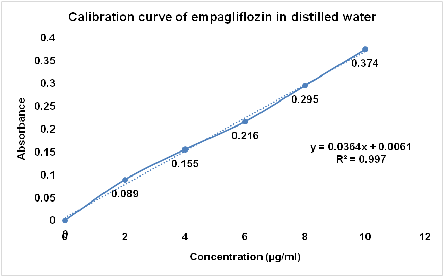 Prior to formulation preparation, a calibration curve of empagliflozin was prepared in methanol, phosphate buffer pH 6.8 HCl, distilled water and then solubility of empagliflozin was determined in various mediums spectrophotometrically at 221.3 nm using UV-visible spectrophotometer (Shimadzu-1800). The compatibility of the drug was assessed by drug-excipient interaction study. The drug was mixed with various excipients in a 1:1 ratio in glass vials which were properly sealed and labeled and kept undisturbed at 50 °C temperature and 75% RH for 15 d. Physical and chemical observations of all the mixtures were done on the initial day and 15th day by thin layer chromatography (TLC) using silica gel G as stationary phase and toluene: methanol (7:3v/v) as mobile phase [11].