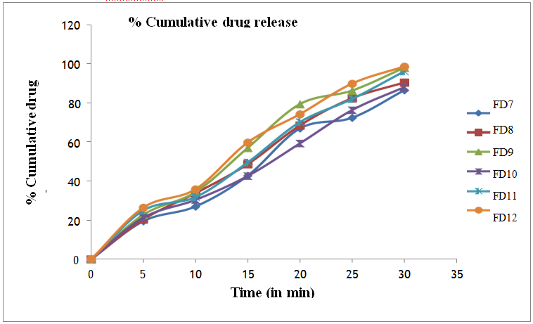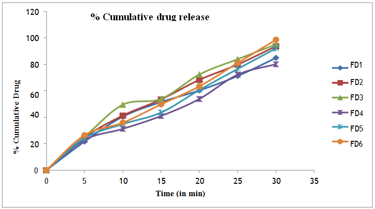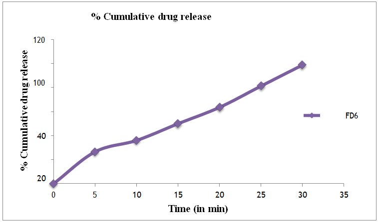 The percentage cumulative drug release from formulations (FD6) was found to be approximately 98% within 30 min.