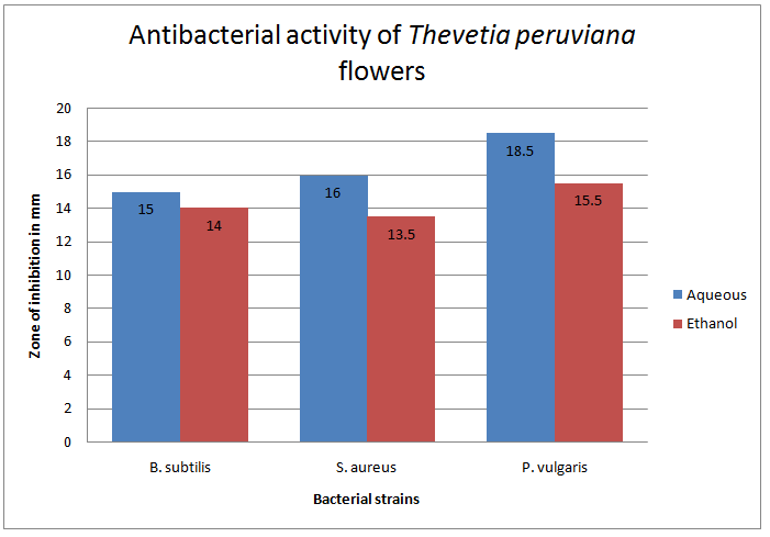 When ethanol and aqueous extracts of both plant parts were compared, aqueous extracts of Thevetia peruviana flowers exhibited maximum antibacterial activity. The results of these experiments suggest that these extracts have good potential for developing bio-inspired antibacterial drugs.