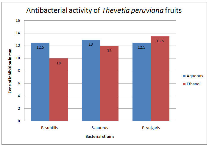 Floral extracts, namely aqueous and ethanol, showed maximum antibacterial activity against Proteus vulgaris with maximum zone of inhibition with a value of 18.5±0.5 mm and 15.5±1.322 mm respectively. In case of fruit extracts of Thevetia peruviana ethanol extracts exhibited maximum antibacterial activity against Proteus vulgaris with a value of 13.5±0.5 mm for zone of inhibition.