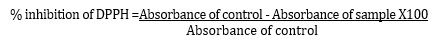 Free radical scavenging activity of plant extracts was determined by spectrophotometer using the standard protocol for DPPH assay. (18) To1 ml methanolic solution of (0.3) mM DPPH, 1 ml test extracts/standard of different concentrations were added. After incubating for 30 minutes at room temperature in a dark chamber, the absorbance was measured at 517 nm against a control. The percentage scavenging activity was expressed as percentage inhibition of DPPH free radical by the sample and was calculated by using the following expression.