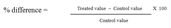 In the present study, all results were expressed as mean ±S. E of the mean. Statistical Package for the Social Sciences (SPSS) program, version 11.0 was used to compare significance between each two groups. Difference was considered significant when P≤0.05. Difference was considered significant when P value was > 0.05. Percentage difference representing the percent of variation with respect to the corresponding control group was also calculated using the following formula.