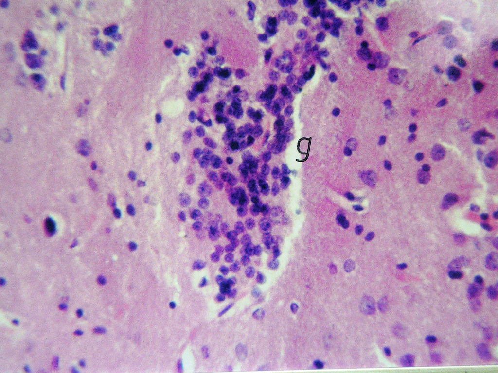 Fig. 4: Micrograph of brain Section of AD rats treated with α-chymotrypcin in a dose of (8.1 unit/rat/day) showed the presence of focal gliosis in the cerebrum associated with the disappearance of most of amyloid plaques.