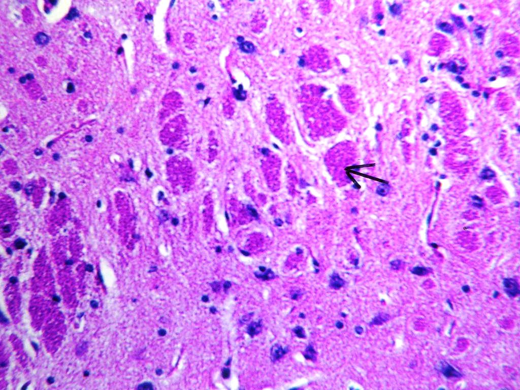 Fig. 3: Micrograph of brain section of Al-intoxicated ovariectomized (AD group) rat showing various sizes of amyloid plaques formation (arrow) in the cerebral cortex and hippocampus (H& E X 40).
