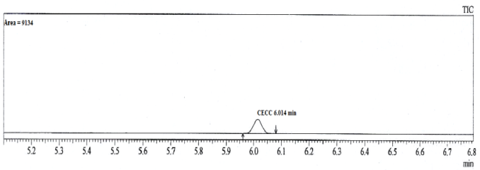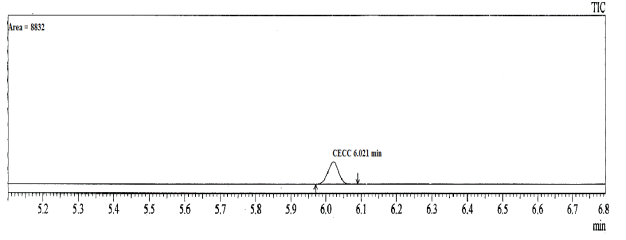 Methods: The development activity was conducted by Gas chromatography technique with Mass spectrometer as detector. DB-5 make Agilent J&W column with length 50 meter, internal diameter 0.32 mm, film thickness 0.52 µm was used. Phase of DB-5 is 5% phenyl, 95% dimethyl polysiloxane and is an intermediate polarity phase with very good selectivity for polar compounds. Hexane was selected as diluent considering the selective solubility of CECC.