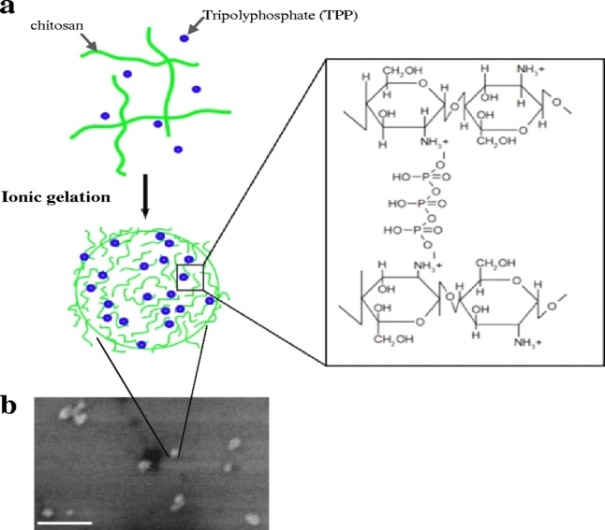 Fig. 1: Formation of the chitosan-tripolyphosphate complex by ionotropic gelation. (a) Schematic illustration of the chitosan-STPP complex and (b) TEM image of chitosan nanoparticles with 35 nm diameter