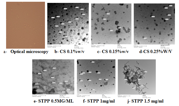 The effect of concentrations of sodium tri poly phosphate (0.5, 1, and 1.5) mg/ml was studied at constant other parameters: concentration of chitosan at (0.2) %w/v, at pH 5, stirring at 1100 r/min, homogenization at 22000 r/min for 3 min and ultra-sonication time 45 min at room temperature.