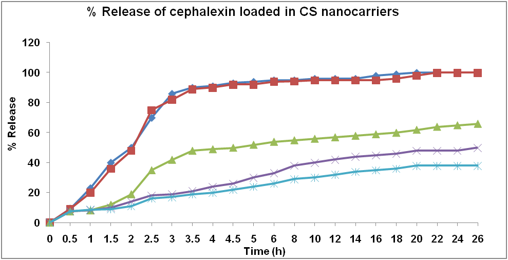 The in vitro release refers to the rate of dissolving the drug from an intact dosage form fragments or particles. There are two reasons for performing in vitro release tests, one of them is to ensure product uniformity from batch to batch, and the other reason is to predict the rate of drug absorption and/or availability of the drug for absorption. In vitro release is more fundamental important than disintegration for predicting in vitro drug availability [30]. The in vitro release studies of cephalexin loaded CSNPs were carried out in USP type II auto sampler dissolution apparatus (Hansen, Germany) fitted with eight rotating paddle and vessels. Five concentrations formulas were used for release study; the medium employed was 600 ml of HCl, pH 1.2 for 2 h then changed to phosphate buffer pH 6.8 at 37°C+0.5 °C. by adding 30 gm of Tri-sodium orthophosphate [31], each concentration was repeated thrice. The paddle speed was 100 r/min. At appropriate intervals(0.5, 1, 1.5 and 2 h) at HCl pH 1.2, (0, 0.5, 1, 1.5, 2, 2.5, 3, 3.5, 4, 4.5, 5, 6, 8, 10, 12, 14, 16, 18, 20, 22, and 24 h) at phosphate buffer pH 6.8, 2 ml of each sample was taken and replaced by fresh dissolution media. The samples were analyzed at 257 nm by UV-visible spectrophotometer.