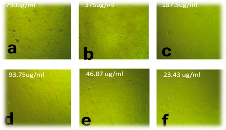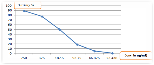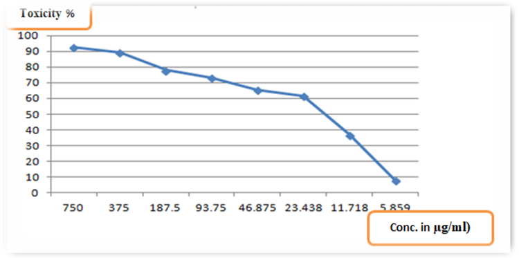 A MTT (3-(4, 5-dimethylthiazol-2-yl)-2,5-diphenyltetrazolium bromide) assay was performed to determine the cytotoxic effects of CSNPs and cephalexin loaded CSNPs on the WI-38 cells (human normal embryonic lung-derived fibroblasts) were purchased from the ATCC (American Type Culture Collection, CCL-75™). A 96 well tissue culture plate was inoculated with 1 X 105 WI-38 cells/ml (100 µl/well) and incubated at 37°C in supplemented DMEM media to develop a complete monolayer sheet. Growth medium was decanted from 96 well micro titer plates after confluent sheet of cells was formed; cell monolayer was washed twice with wash media. Serial two-fold dilutions of CSNPs and cephalexin loaded CSNPs were made in DMEM media with 2% FBS (maintenance medium). After that 0.1 ml of each dilution was tested in different wells leaving 3 wells as control, receiving only maintenance medium. Plate was incubated for 24 h at 37°C and examined. Cells were checked under inverted microscope for any physical signs of toxicity, e. g. partial or complete loss of the monolayer, rounding, shrinkage, or cell granulation. MTT solution was prepared (5 mg/ml in phosphate buffer saline) then 20 µl of MTT solution were added to each well. The plate was placed on a shaking table (150 rpm for 5 min) to thoroughly mix the MTT into the media and incubated at 37°C in 5% CO2 for 1-5 h to allow MTT to metabolize. The media were dumped off then the plate was dried on paper towels to remove any residue. Formazan (MTT metabolic product) was re-suspended in 200 µl DMSO and placed on a shaking table (150 rpm for 5 min) to thoroughly mix the formazan with the solvent. Optical density was measured at 560 nm using a multiwall microplate reader (Synergy HT, BioTek, France,) and background was subtracted at 620 nm. Optical density is directly correlated with cell quantity. The experiment was performed in triplicate, and the result is expressed as the mean±SD [38].