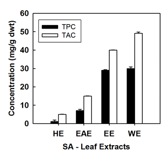 Fig. 2: It shows total phenolic content (TPC) and total antioxidant capacity (TAC) of SA- leaf extracts. HE: hexane, EAE: ethyl acetate, EE: ethanol, WE: water extract