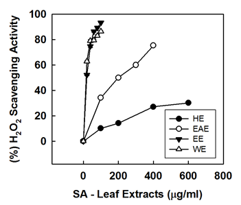 Fig. 4: It shows hydrogen peroxide scavenging activity of SA- leaf extracts. HE: hexane, EAE: ethyl acetate, EE: ethanol, WE: water extract