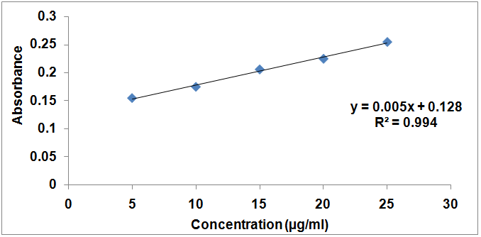 The Colored complex of the sample was analyzed using double beam spectrophotometer, the Absorbance of all standards (converted to colored complex) were taken to construct a calibration curve, as shown in fig. 1. The linearity was in compliance with the regression plot in the concentration range of 5–25 μg/ml with a correlation coefficient (R2) of 0.994. Fig. 1 showed the linear graph between concentrations of standard Ascorbic acid and its absorbance, as per Beer’s Lamberts Law.
