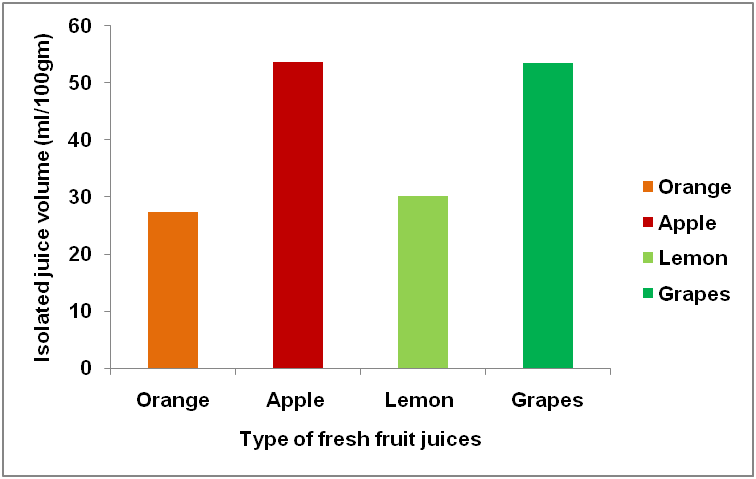 Simple isolation technique was followed to collect the juice from fresh fruits using slicing and squeezing technique followed by filtration. Due to a variety of fruits and their content of liquid part, a variation on their yield was observed. As per the data we obtained, there was almost equal yield in fruit juices among apple and grapes with content slight above 50 ml per 100 gm of fruit. However, orange and lemon possess 1/3rdyield of fruit mass which was found to be roughly 27 and 30 ml per 100 gm of fruits, as shown in fig. 2.