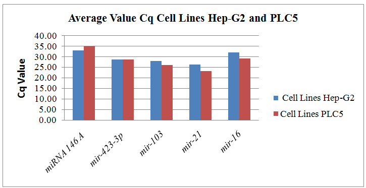 There are two methods to analyze the results of RT-PCR (qPCR): absolute quantification method (measure Cq sample to standard curve) and relative quantification (compare Cq sample to Cq reference gene). In this study, the latter method was used. The result show that the average of Cq mir-423-3p, mir-103, mir-21 and mir-16 are higher on cell lines Hep-G2 than PLC5. The average of miRNA 146 A Cq is higher on cell lines PLC5 than cell lines Hep-G2 as shown on fig. 1.