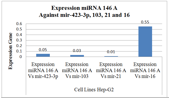 The highest gene expressions in cell lines Hep-G2resulted; miRNA 146 A to mir-16, miRNA 146 A to mir-423-3p, miRNA 146 A to mir-103, miRNA 146 A to mir-21 are 0.55, 0.05, 0.03 and 0.01 respectively. For comparison, Peltier HJ which was conducted to lung cancer resulted in expression on mir-16 (-1,576) [9, 10, 14].