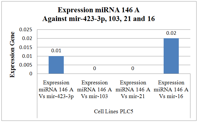 The highest gene expressions in cell lines PLC5 resulted; miRNA 146 A to mir-16, miRNA 146 A to mir-423-3p, miRNA 146 A to mir-103, miRNA 146 A to mir-21 are 0.02, 0.01, 0.00 and 0.00 respectively. The expression of miRNA 146 A on cell lines PLC5 which was conducted Akira Tomokuni was1,00[10-11, 15].