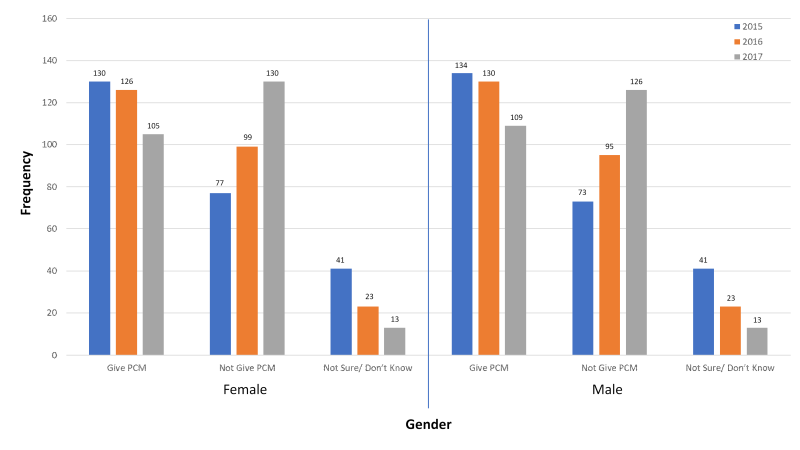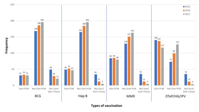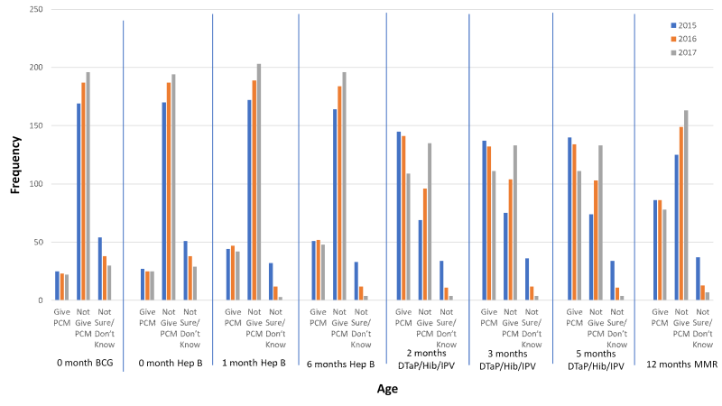 Refer to fig. 1 till 3 for year 2015 till 2017, according to gender, age of the baby upon vaccination and types of vaccination, the trends of PCM dispensing practice was increasing for “Not Give PCM” and on the other hand it was decreasing for “Give PCM” over three years of 2015 till 2017 (fig. 1-3). This might be due to the counterproductive effect of PCM on the vaccine injected which may cause the vaccine less effective.