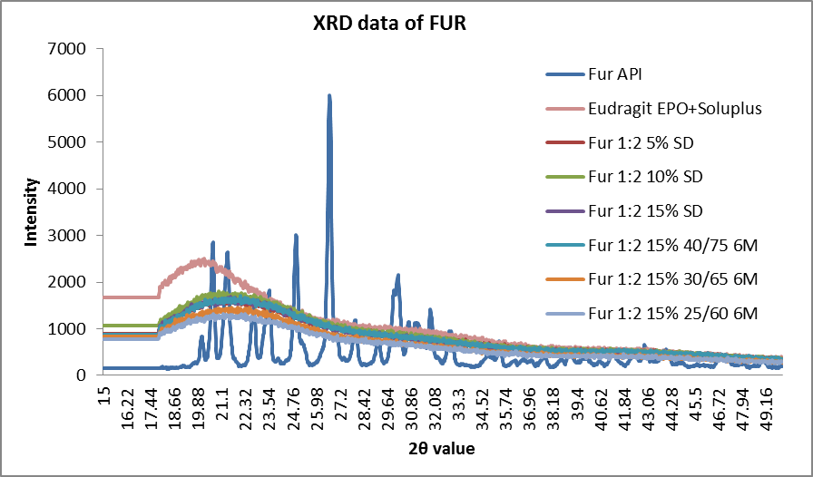 XRD is a fundamental technique used to detect a crystalline form of substance and data shows that FUR was in crystalline form. The absence of sharp peaks in the polymer sample confirmed their amorphous nature. In fig. 2, XRD data shows sharp peaks of FUR and absence of peaks in SD samples confirmed the amorphous form of FUR after HME.