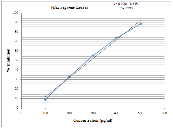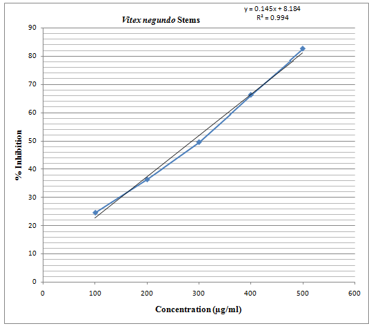 The DPPH assay is extensively used for the evaluation of free-radical scavenging potential of antioxidative compounds. DPPH is a stable nitrogen-centered free radical the color of which changes from violet to yellow upon reduction by either the process of hydrogen or electron donation. Substances which are able to perform this reaction can be considered as antioxidants and therefore radical scavengers [22]. In the present study, the crude methanolic extracts of different parts of Vitex negundo and Ascorbic acid (IC50 = 16.33 ± 0.325 μg/mL) were shown to serve as potent antioxidant agent or hydrogen donor that can scavenge radicals. It was found that the radical-scavenging activities of all the extracts increased with increasing concentration.