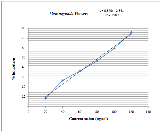 The significant scavenging activity of the extracts may be attributed to the presence of phenolic and flavonoid content. These results indicated that methanolic extracts of different Plant parts of Vitex negundo have significant Free Radical Scavenging activity and thus exhibited the significant antioxidant potential. The IC50 values are reported in table 2 and graphs of DPPH radical-scavenging activities of different plant parts extracts are shown in fig. 1-5.