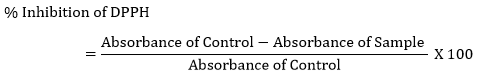 The IC50 value is the concentration (in μg/mL) of sample (extract/standard) that provided 50% inhibition of the DPPH radical. Linear graph of concentration Vs percentage inhibition was prepared and IC50 values were calculated. The lower the IC50 value indicates high antioxidant capacity.