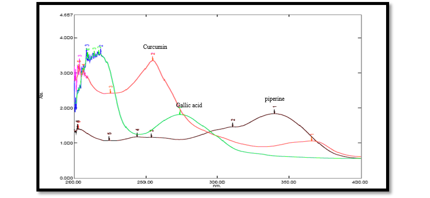 Fig. 1: UV spectrum overlain spectrum of gallic acid, curcumin and piperine