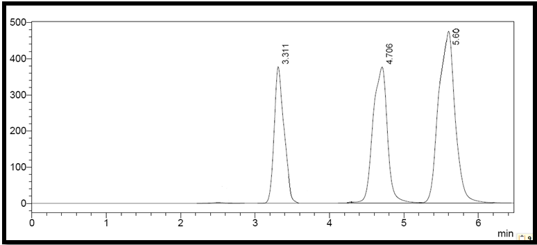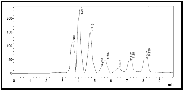 The mobile phase optimized for the RP-HPLC method was methanol: acetonitrile: water (pH 3.2adjusted by using orthophosphoric acid) 20μlinjection volume was applied at 25 °C and the flow rate was kept at 0.8 ml/min. The retention time of gallic acid, curcumin and piperine was found to be 3.3, 4.7and 5.6 min respectively.