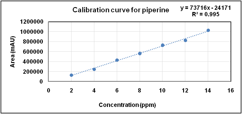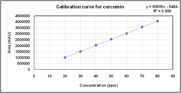 Standard stock solution was diluted to obtain 10-70 ppm, 20-80 ppm and 2-14 ppm of gallic acid, curcumin and piperine, respectively. Three sets of each individual solutions were evaluated. Every set was analysed to obtain a calibration curve. The standard deviation (SD), coefficient of determination (r2), slope and intercept of the curves were estimated to determine the method of linearity.