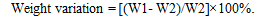 | Code | Weight of 10 tablets | Difference in the weights (W1-W2) |